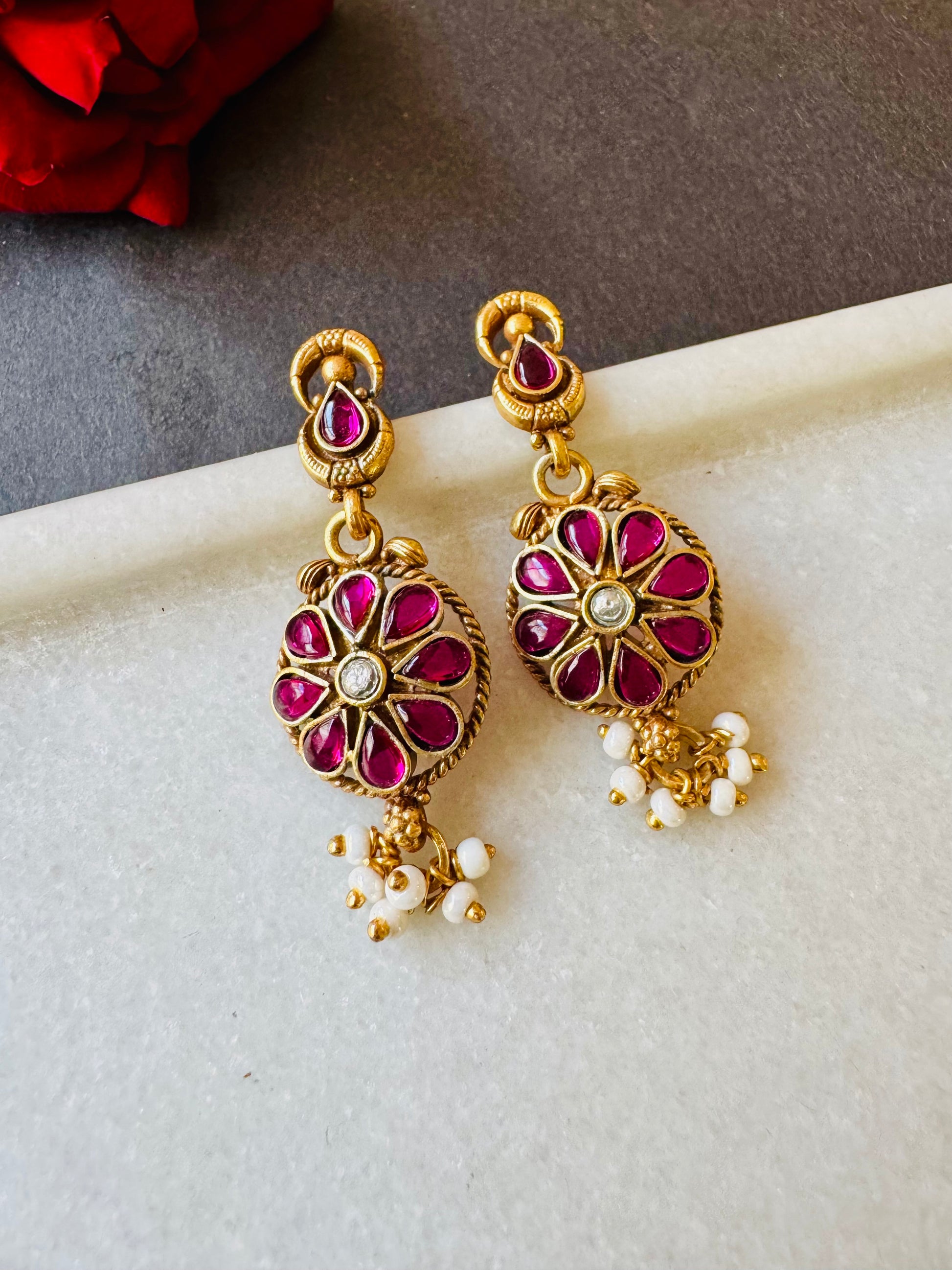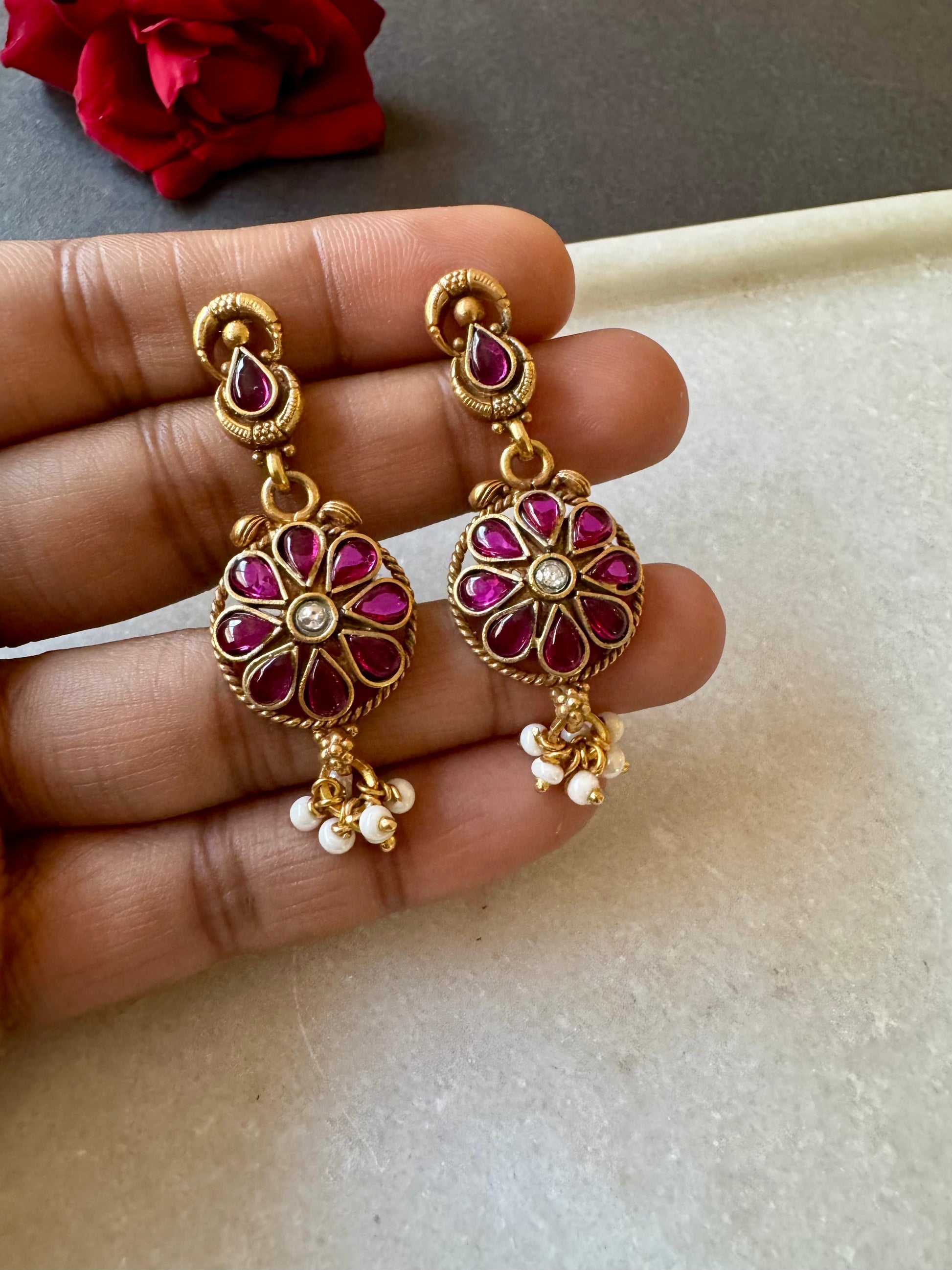 Features ruby-toned petals and tiny pearl clusters for a festive touch.