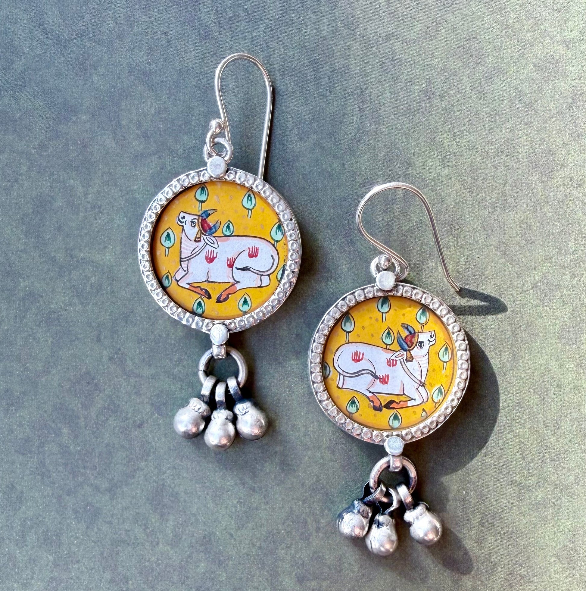 Part of the Leela collection, these hand-painted silver earrings feature the Kamdhenu cow, brought to life through miniature artwork and vibrant color.