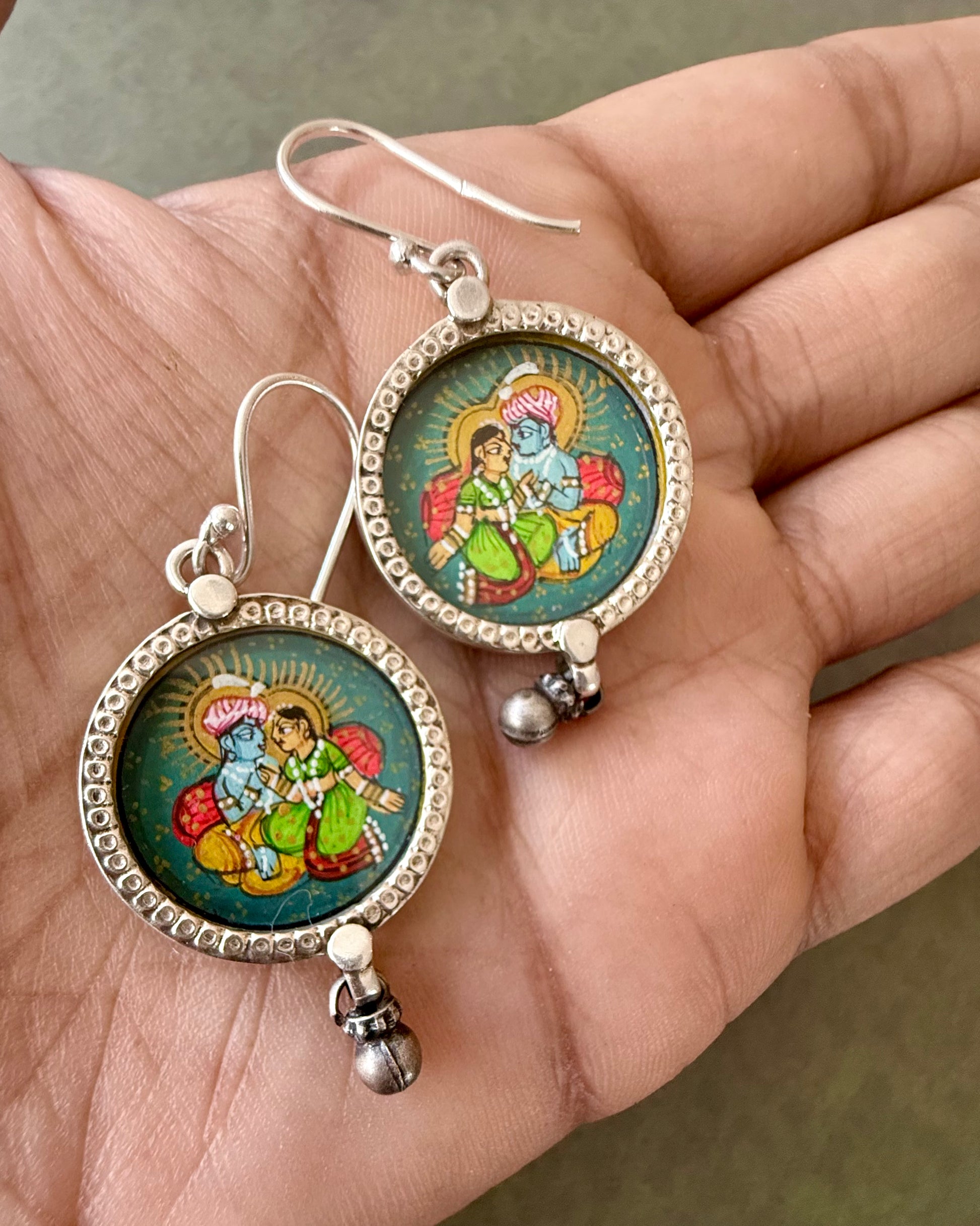 Part of the Leela collection, the Milan silver earrings capture a moment of connection through hand-painted miniature artwork.