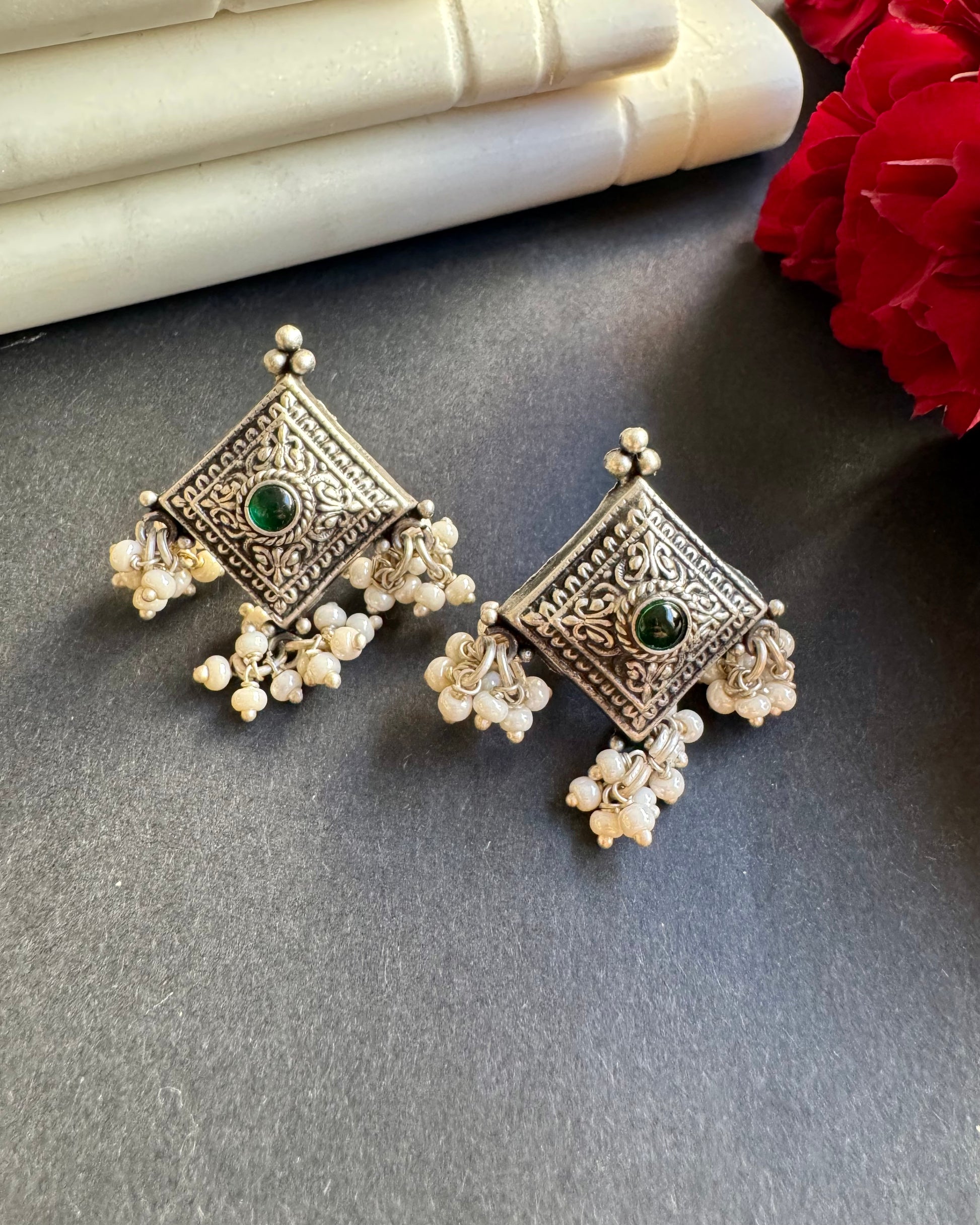 Small but such a statement! These unique square studs in 92.5 silver with intricate work and pearl drops are perfect when you want something different yet easy to wear. ✨