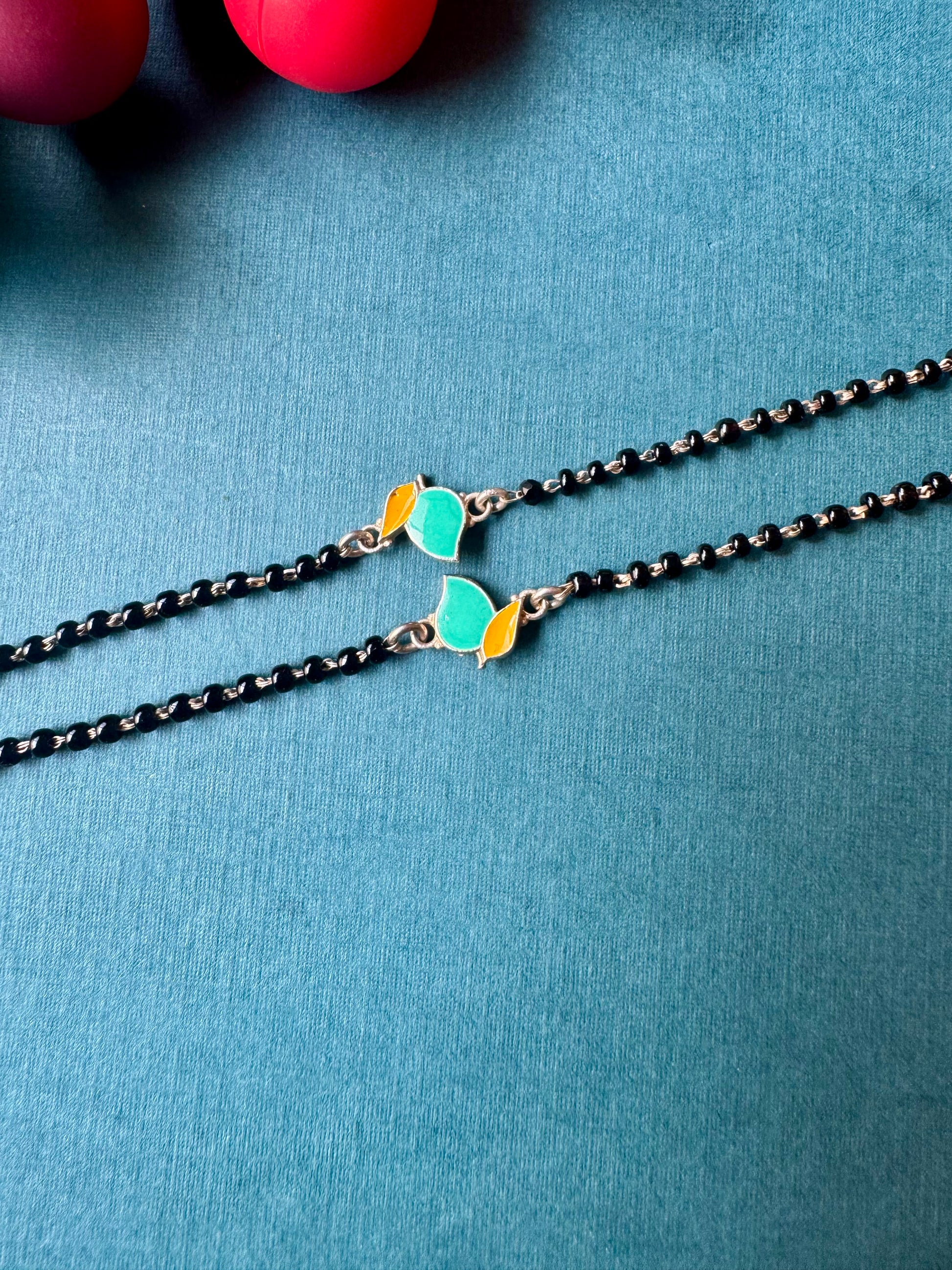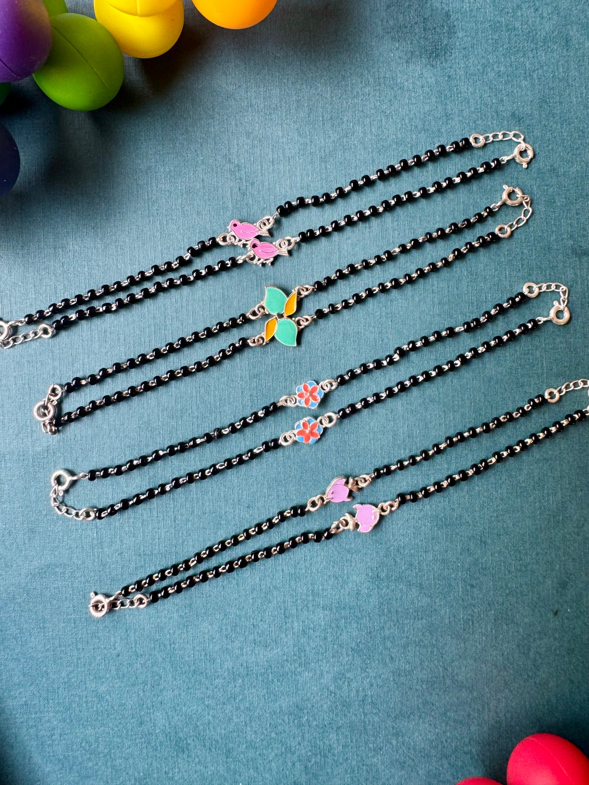 A playful twist to a traditional keepsake. Made in 92.5 sterling silver with classic black beads and colorful enamel charms.. butterflies, flowers, birds, and more.