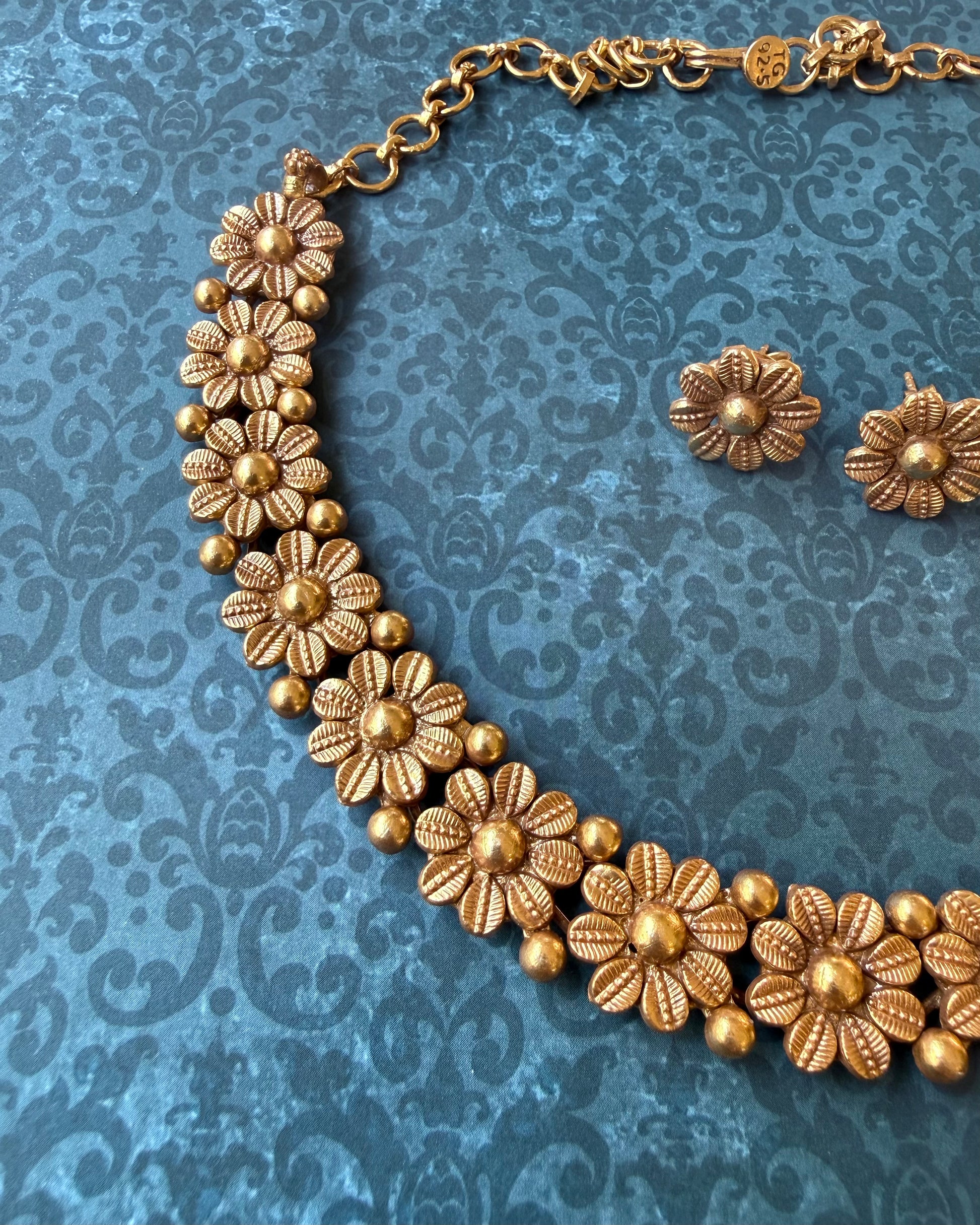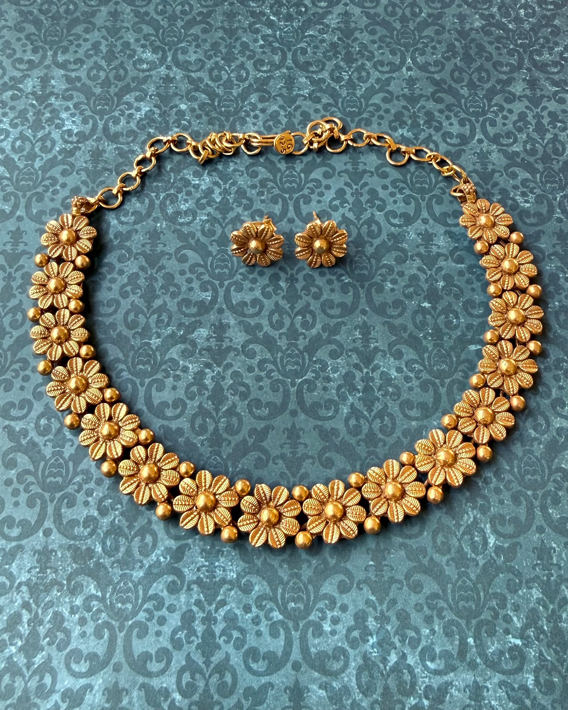 A timeless floral necklace set handcrafted in 92.5 sterling silver with a soft gold polish. Detailed with delicate floral motifs, this set is designed to be versatile and easy to style for both everyday wear and special occasions.