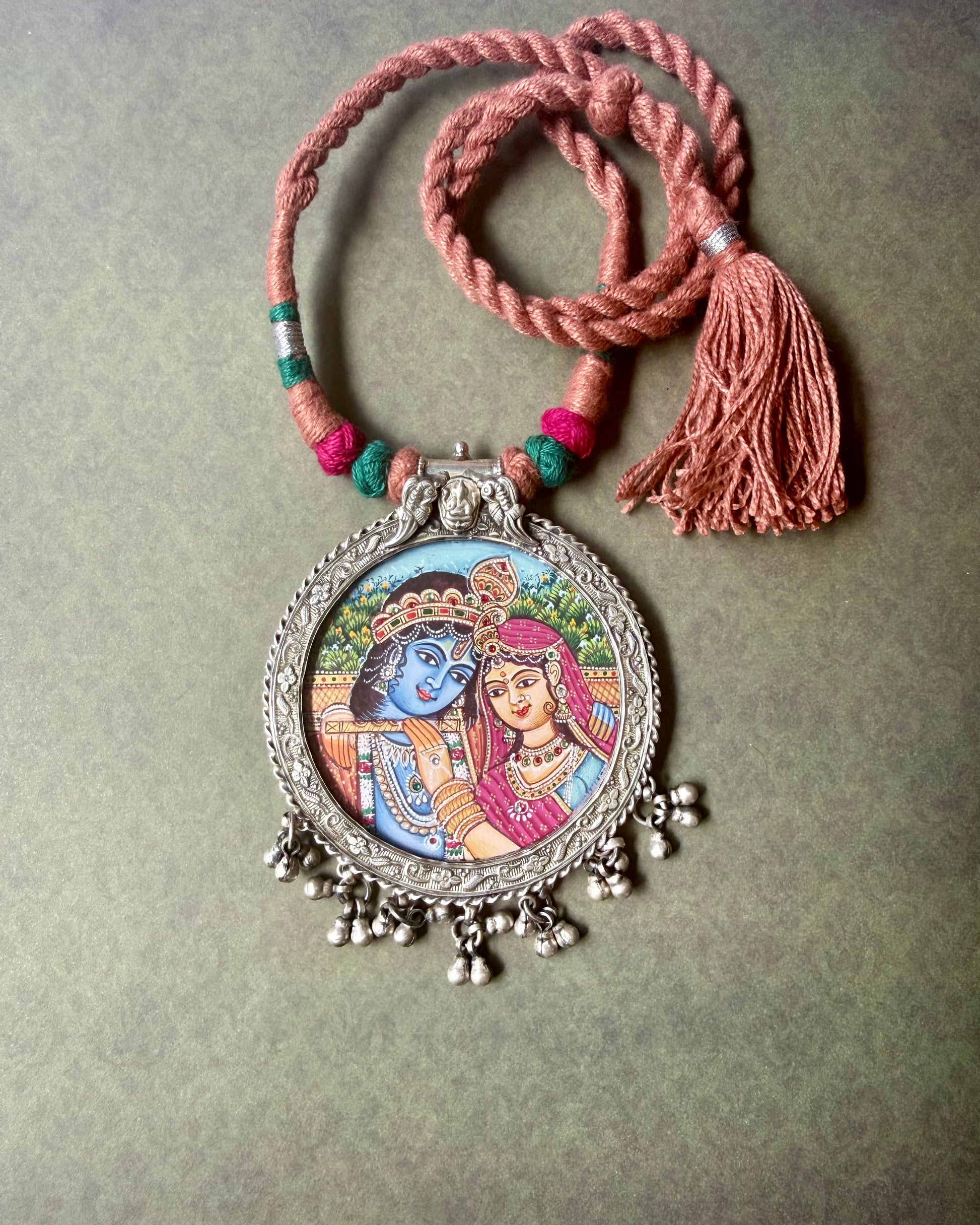 These hand-painted silver pendants bring miniature artwork to life through color, detail, and storytelling. Part of the Leela collection, each pendant is crafted in 92.5 sterling silver and paired with a soft cotton dori finished with an adjustable knot for flexible length and easy styling.